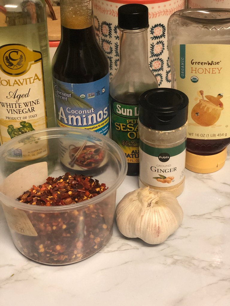 - In a shallow dish, whisk together the coconut aminos, ginger powder, sesame oil, white wine vinegar, honey, garlic cloves, and red pepper flakes