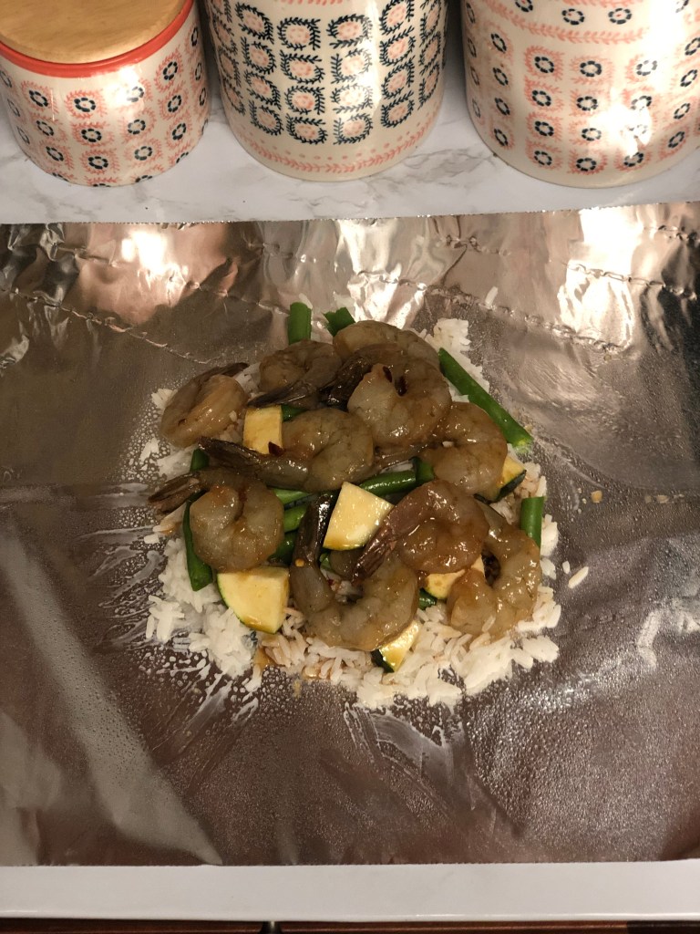 - Layer your packets evenly with rice then veggies then shrimp; top each packet with left over sauce from the shrimp marinade