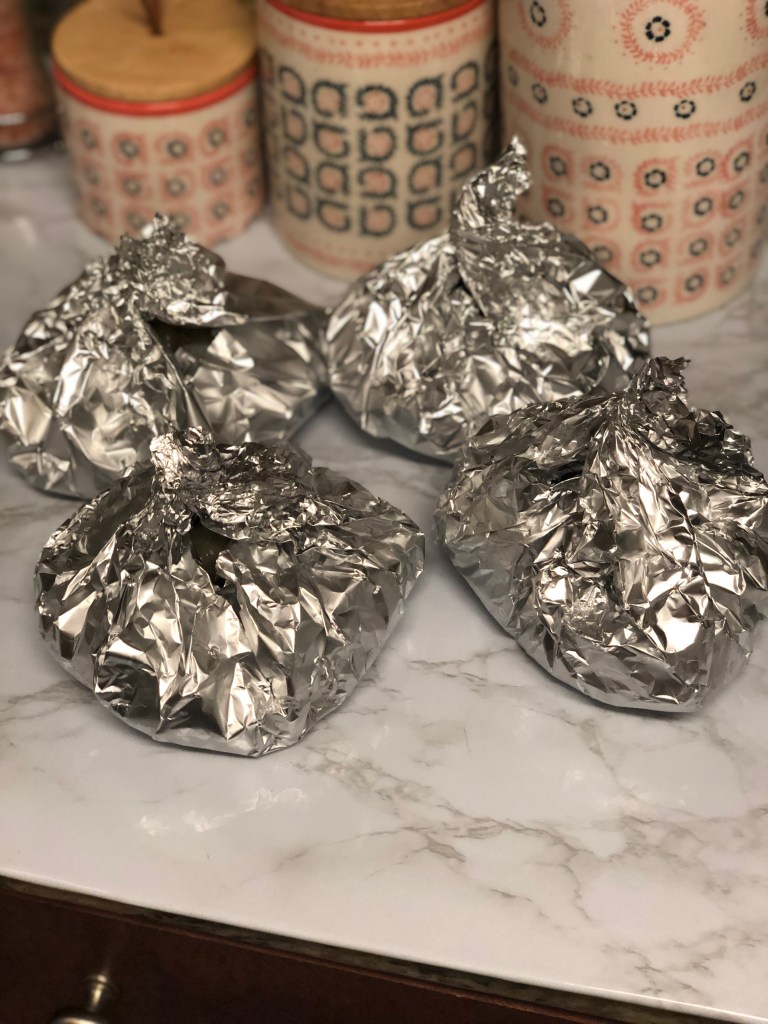 - Lay out 4 large pieces of aluminum foil and spray each with cooking spray