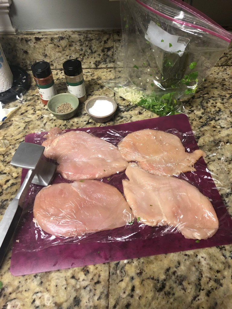 - Place chicken breasts on a large cutting board and cover with plastic wrap and pound until the chicken breasts are the same thickness throughout; you can skip this step but it helps the chicken cook evenly and makes it juicy and tender