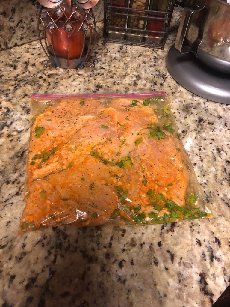 - Place the chicken breasts in a large zip lock bag and add all of the ingredients and shake up until the chicken is evenly coated