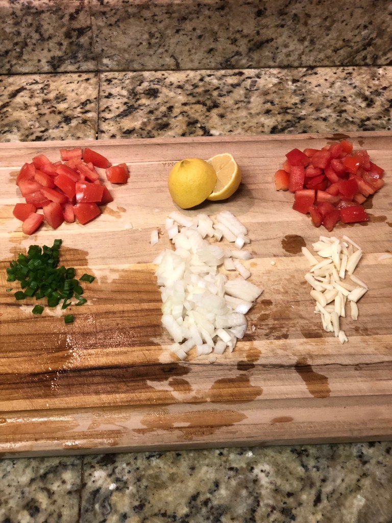 - Dice your onion, slice your garlic cloves and chop up your tomatoes and green onions; set aside