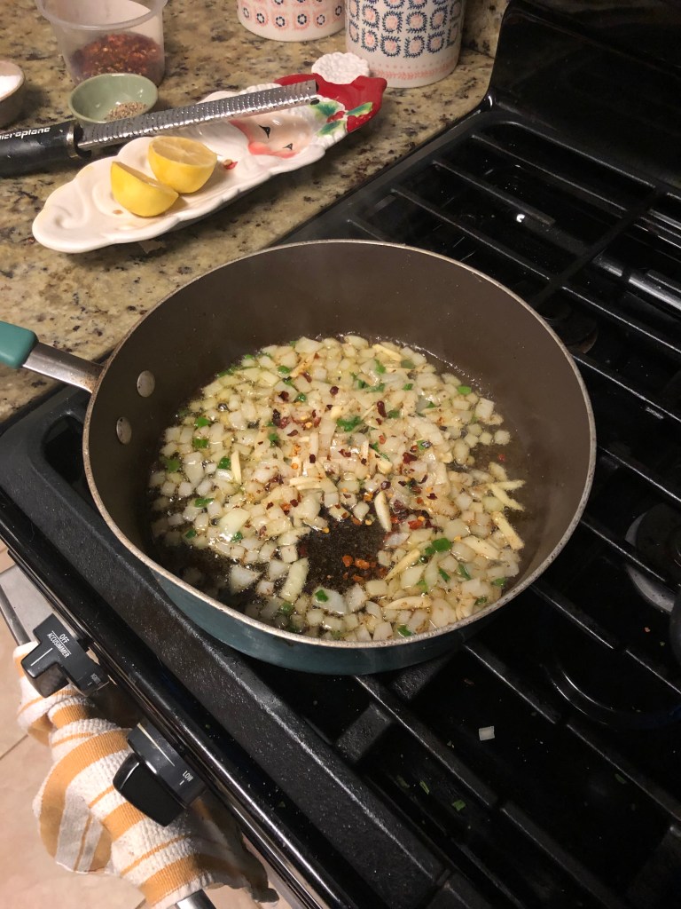 - Add olive oil, lemon zest and a few grinds of fresh black pepper to a large skillet over medium-low heat; heat up for about 2 minutes