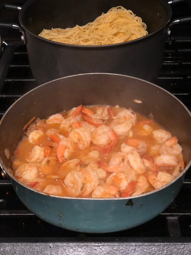 - Raise the heat to medium and nestle in about half of your shrimp