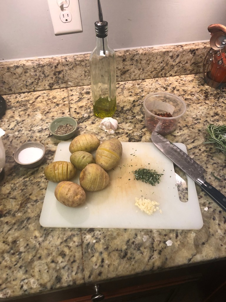 - Cut slits into your potatoes about 3 mm spaced apart – not all the way to the bottom (see pic below)