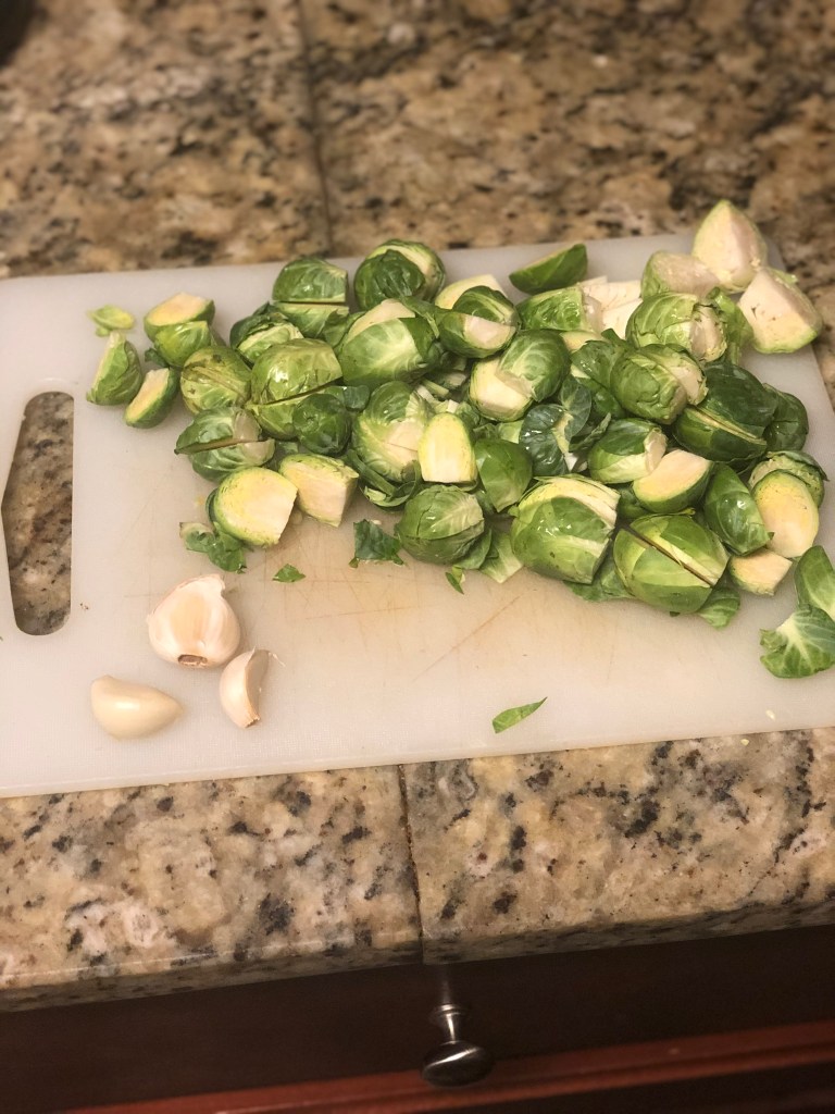- Mix up your brussels and stir in the minced garlic and season with salt and pepper