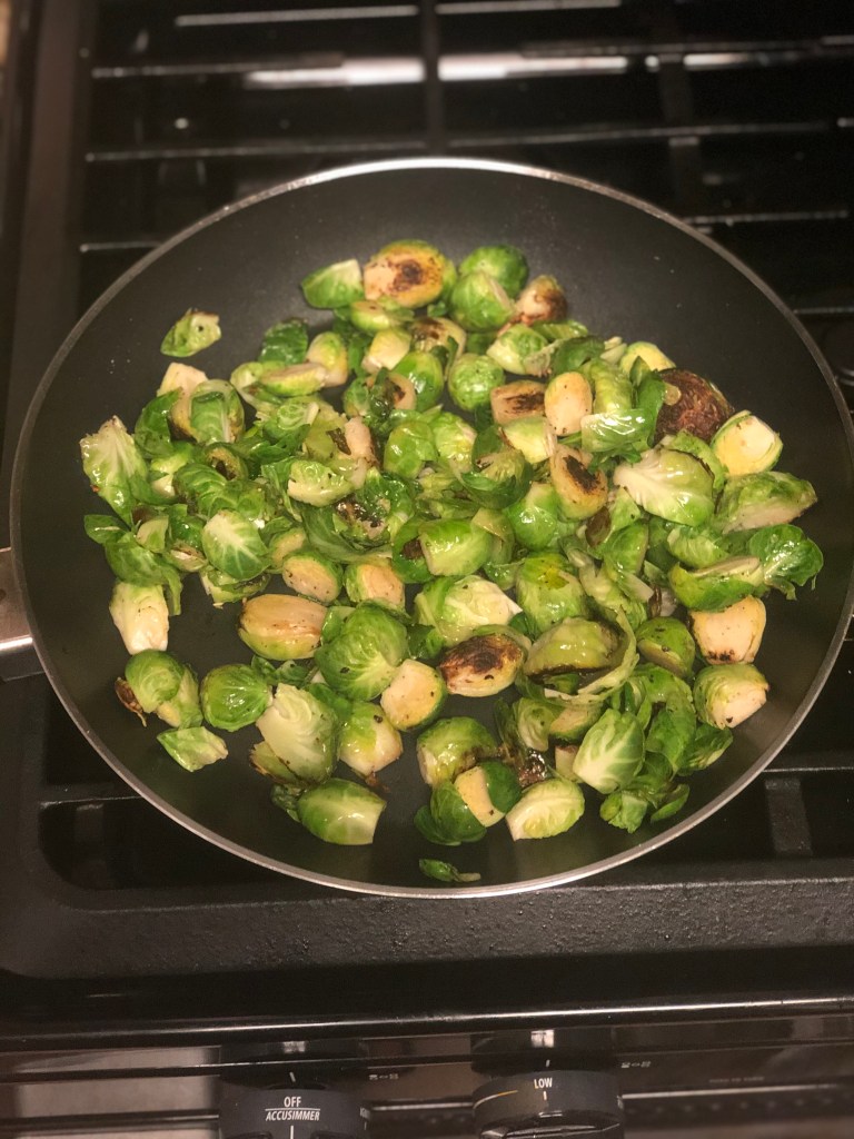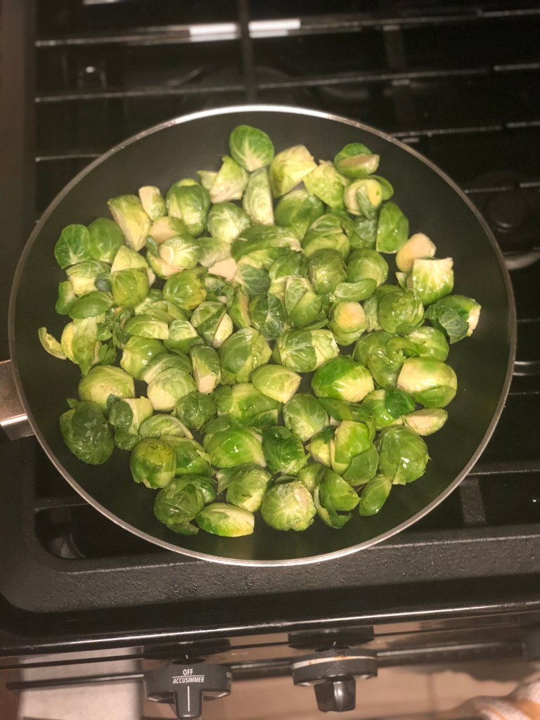 - Add your brussels to the skillet faced down and let them cook for 10 minutes without disturbing them