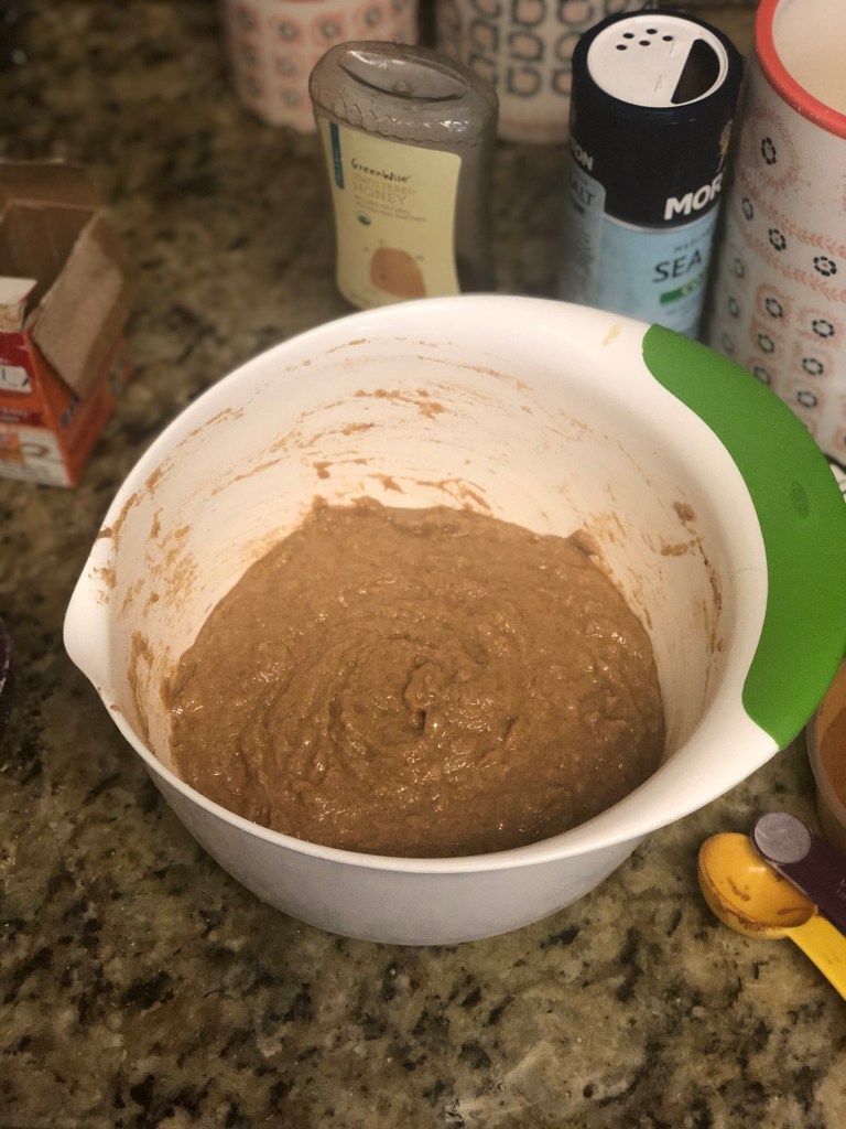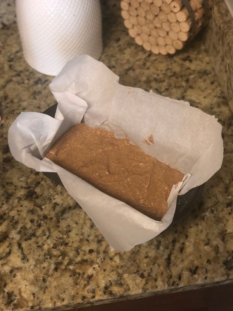 - Transfer the bread mixture to your loaf pan tapping it lightly on the counter to even out the mix