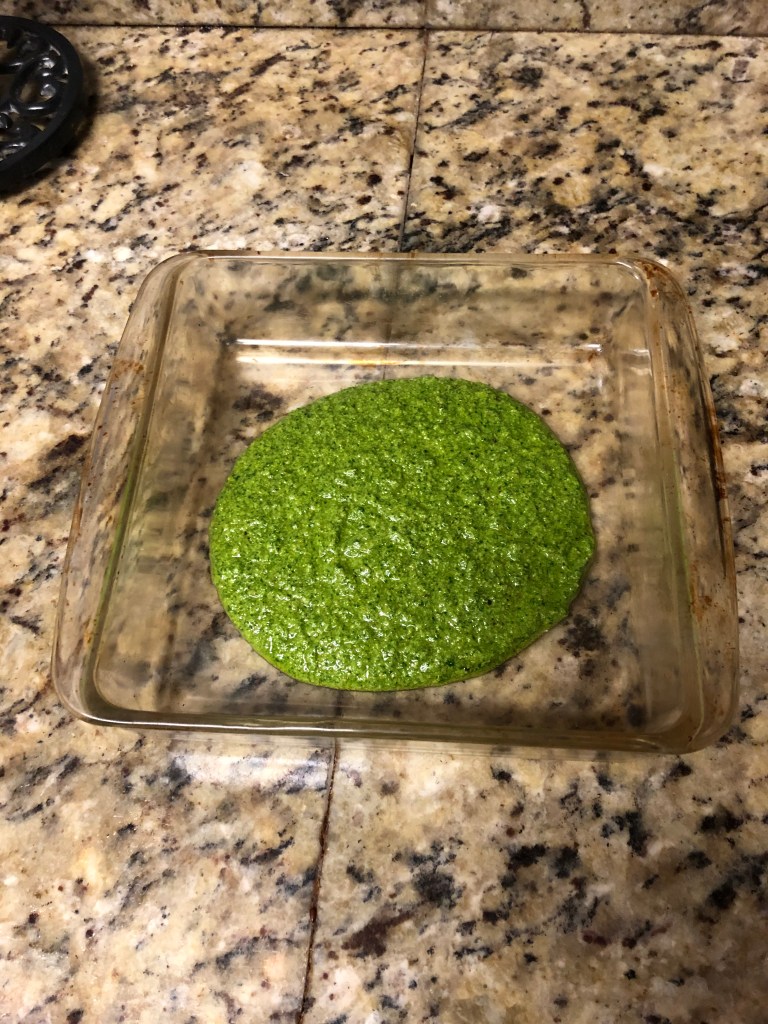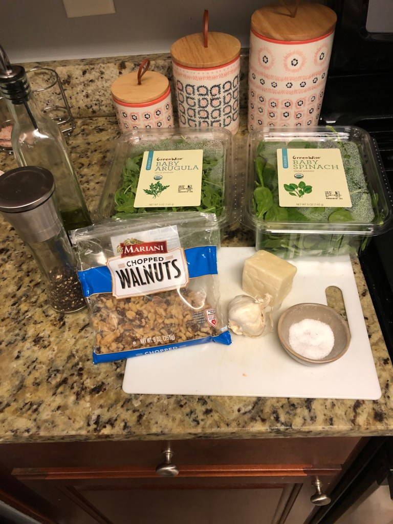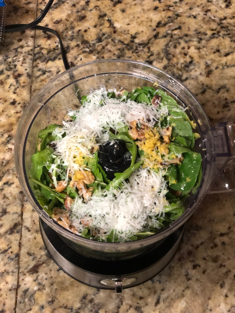 - As your pesto is blending, slowly pour olive oil in to mix well