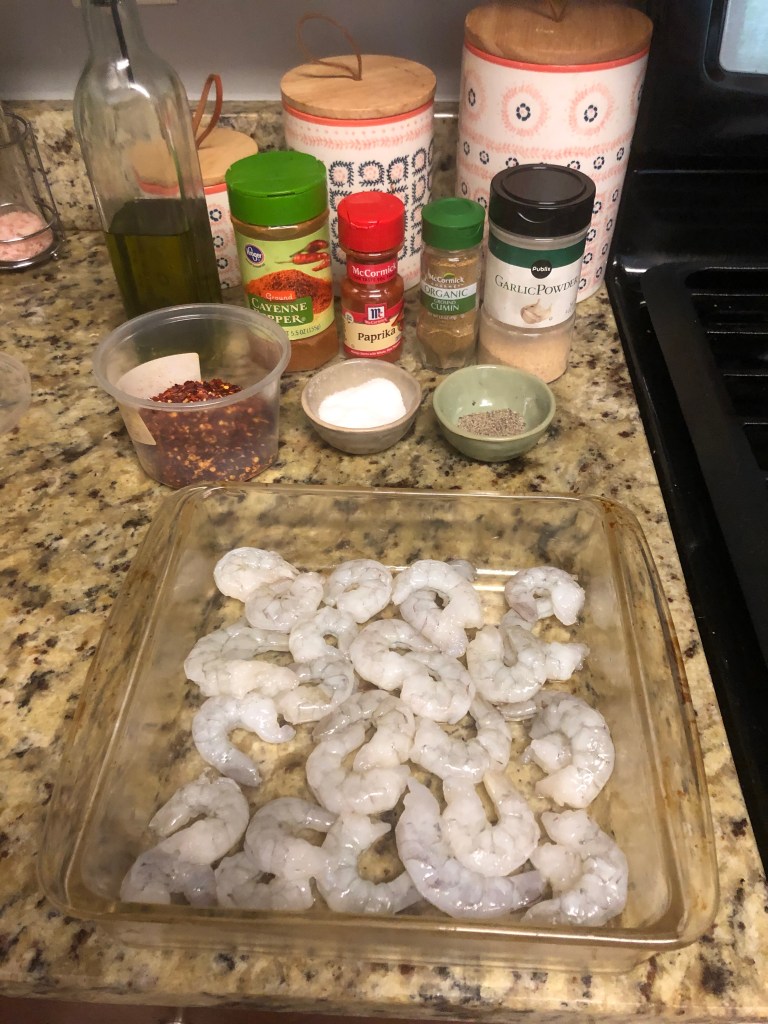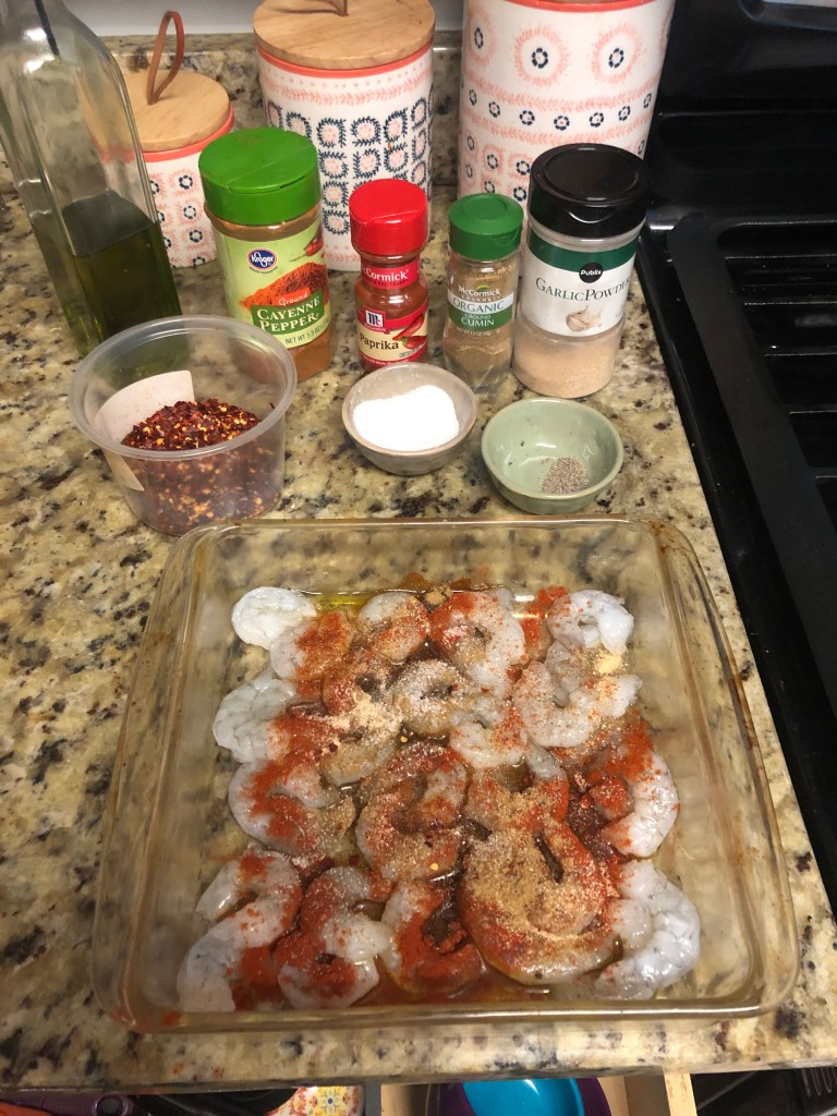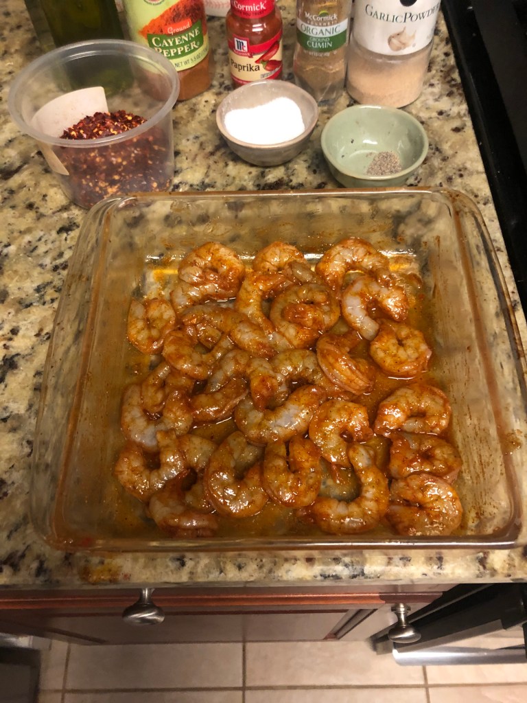- Place all ingredients for shrimp in a shallow dish or zip lock bag and mix up until shrimps are completely covered with marinade. Place in fridge