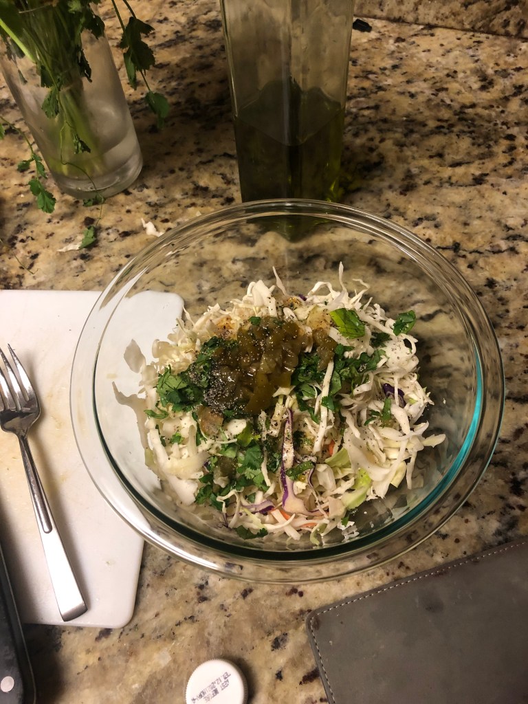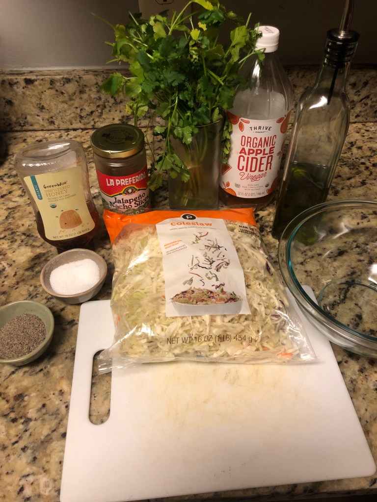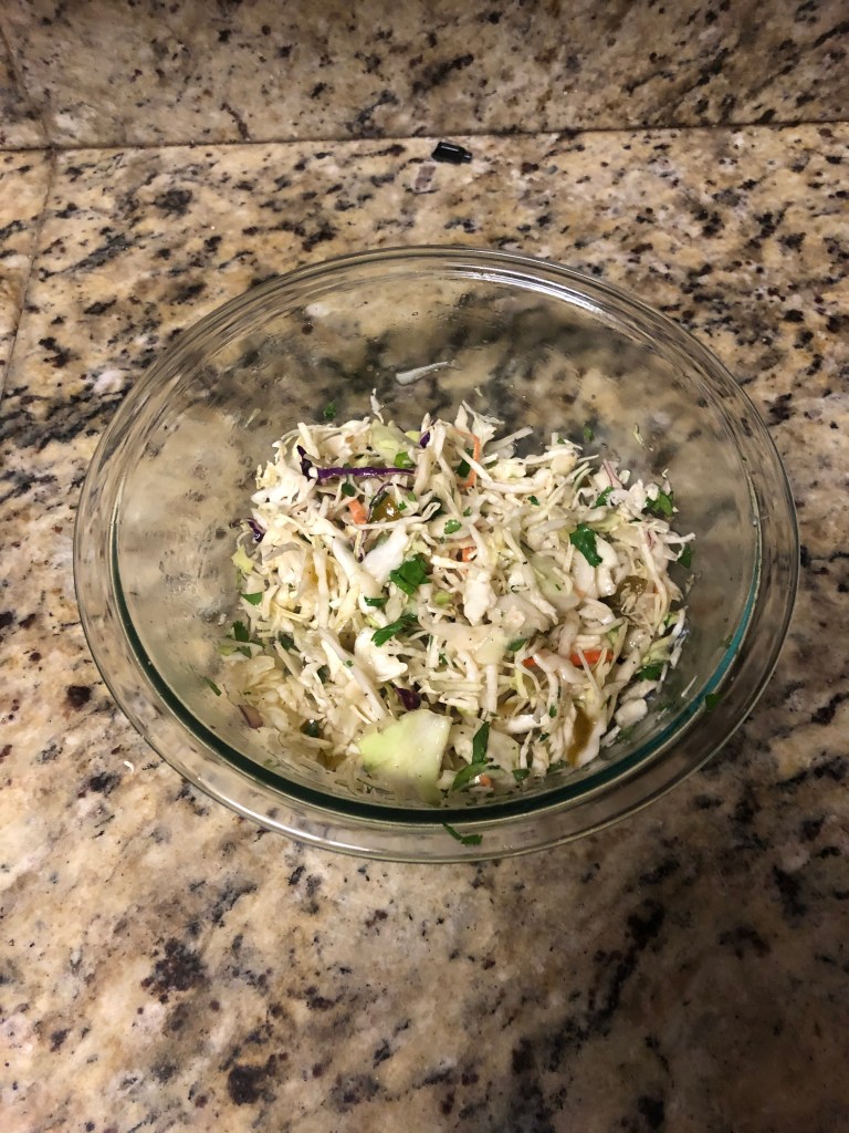 - Mix all ingredients for slaw together in a large bowl and place in fridge