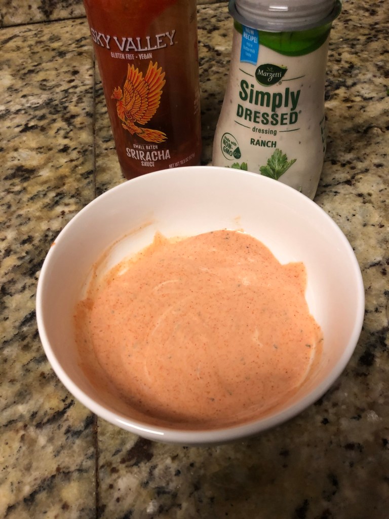 - Mix sauce ingredients together in a small bowl and place in fridge (for every 1/4 cup of ranch use 1 TBS of sriracha)