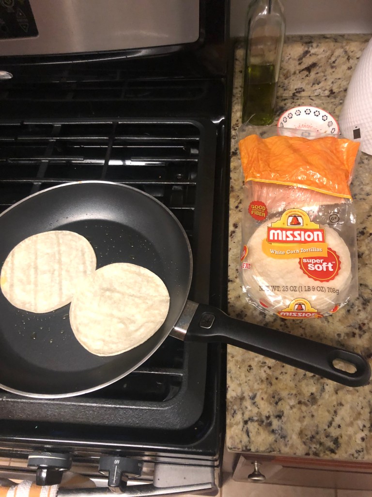 - Heat your corn tortillas for about 1-2 minutes per side – you want them warm and playable so don’t over cook them or they will get too crunchy. Set aside