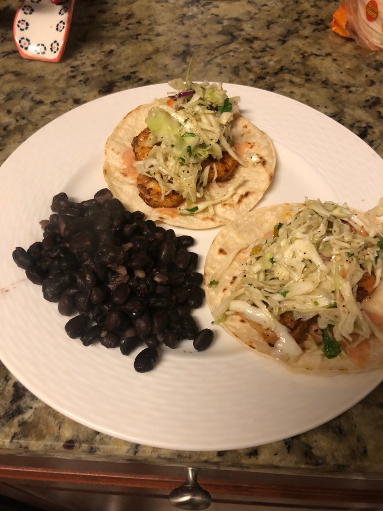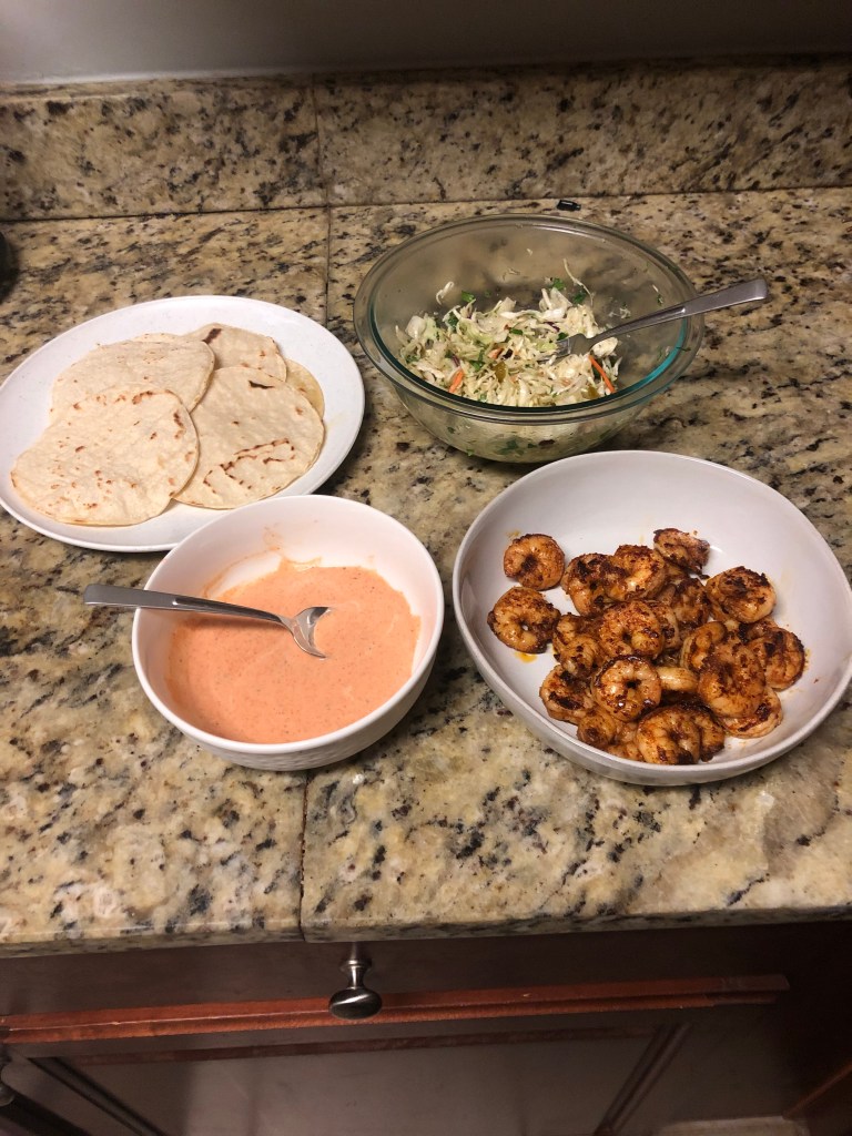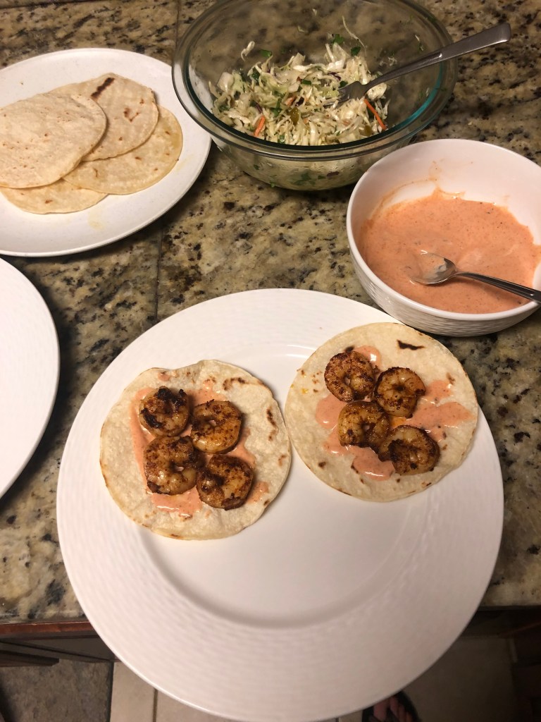 - Build your tacos – tortilla, sauce, shrimp, coleslaw mix, more sauce (if you’re like me and need things saucy!)