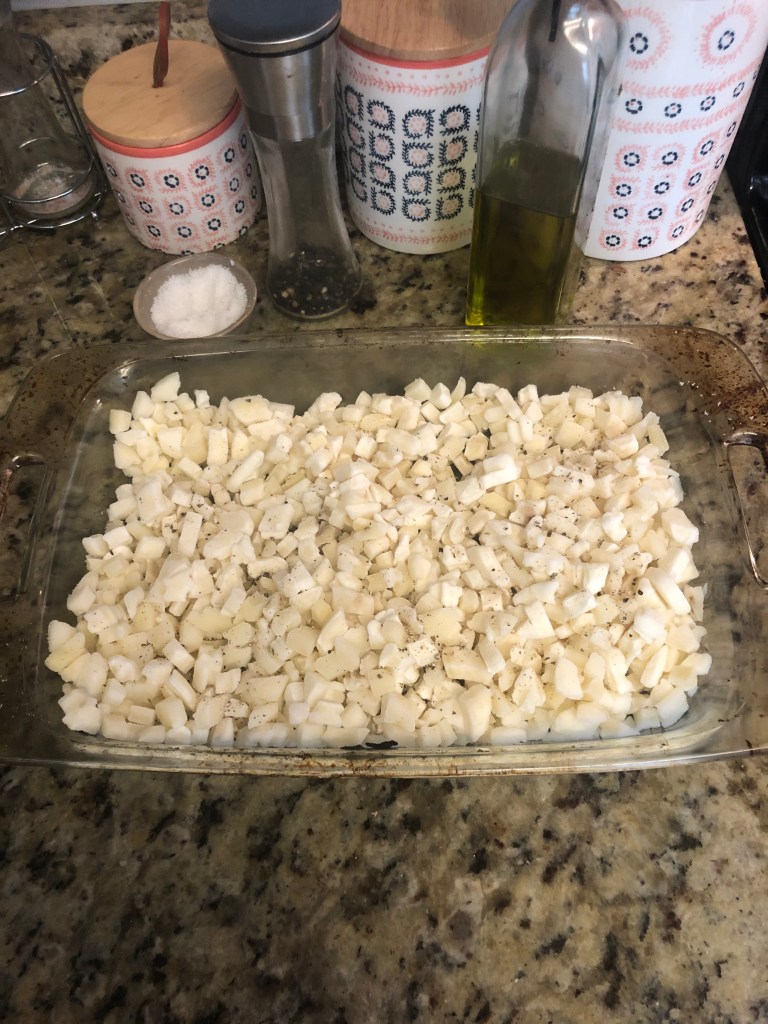 - Place your hashbrowns in the baking dish and pour some olive oil on them and season with salt and pepper; set aside