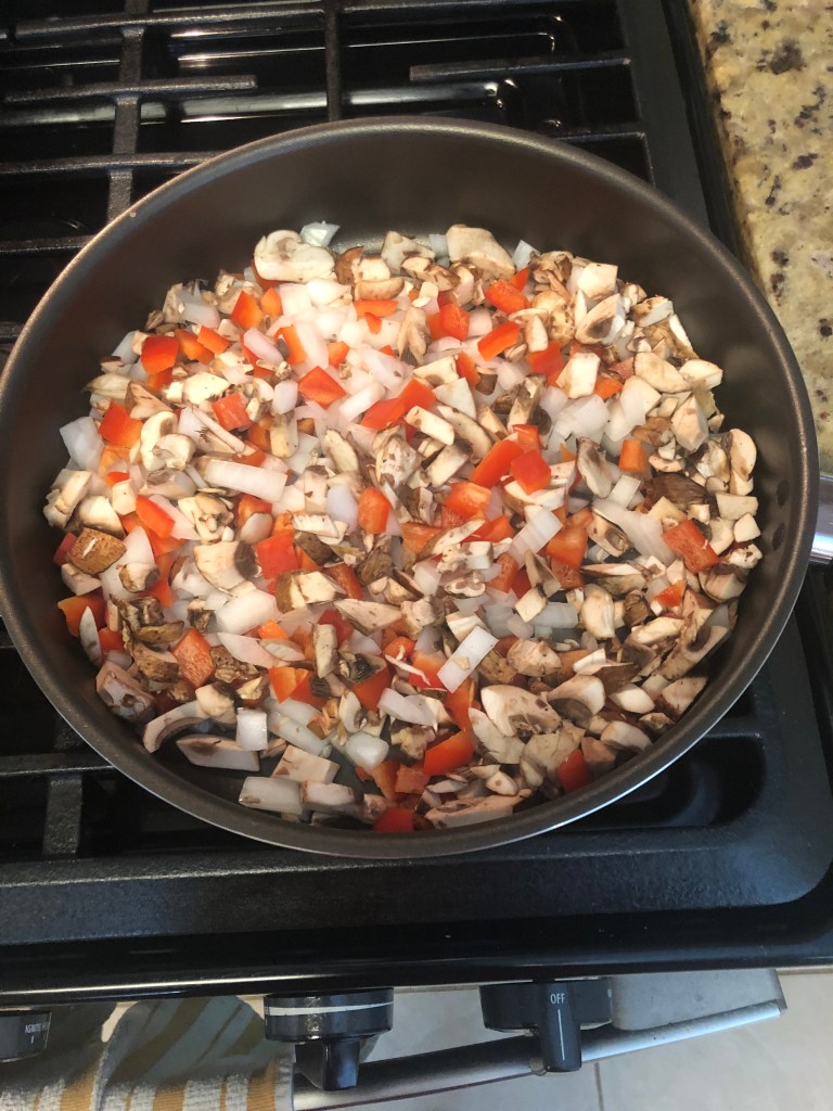 - Dice your pepper, onion and mushrooms; set aside