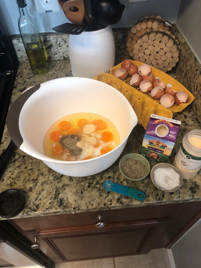 - Break your eggs into a large mixing bowl and add in 1.5 tsp sea salt, 1 tsp garlic powder and 1 tsp of pepper and whisk well