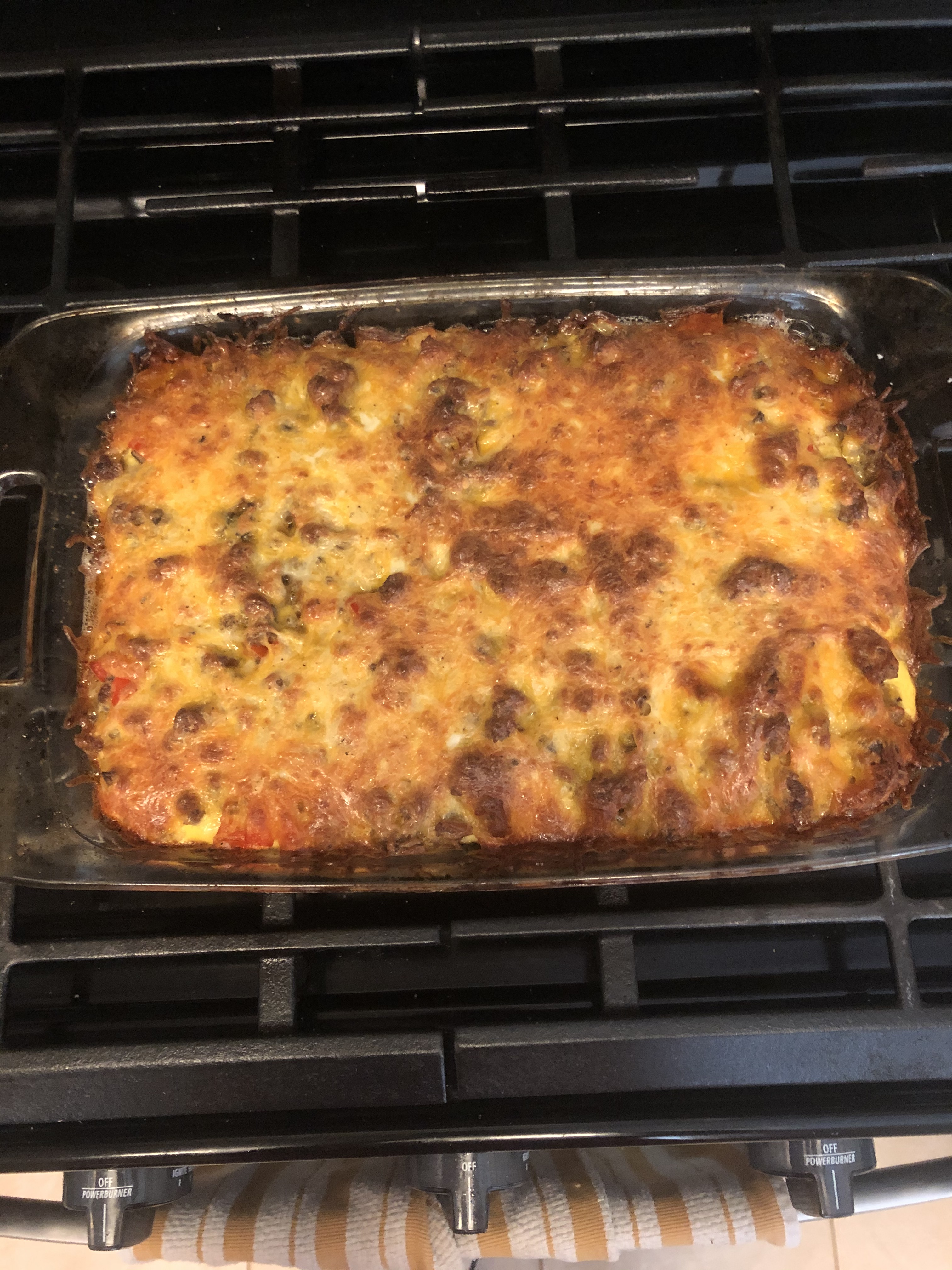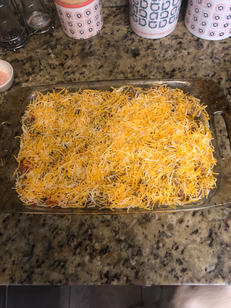 - Pour your meat mixture over your hash browns and top with the cheese