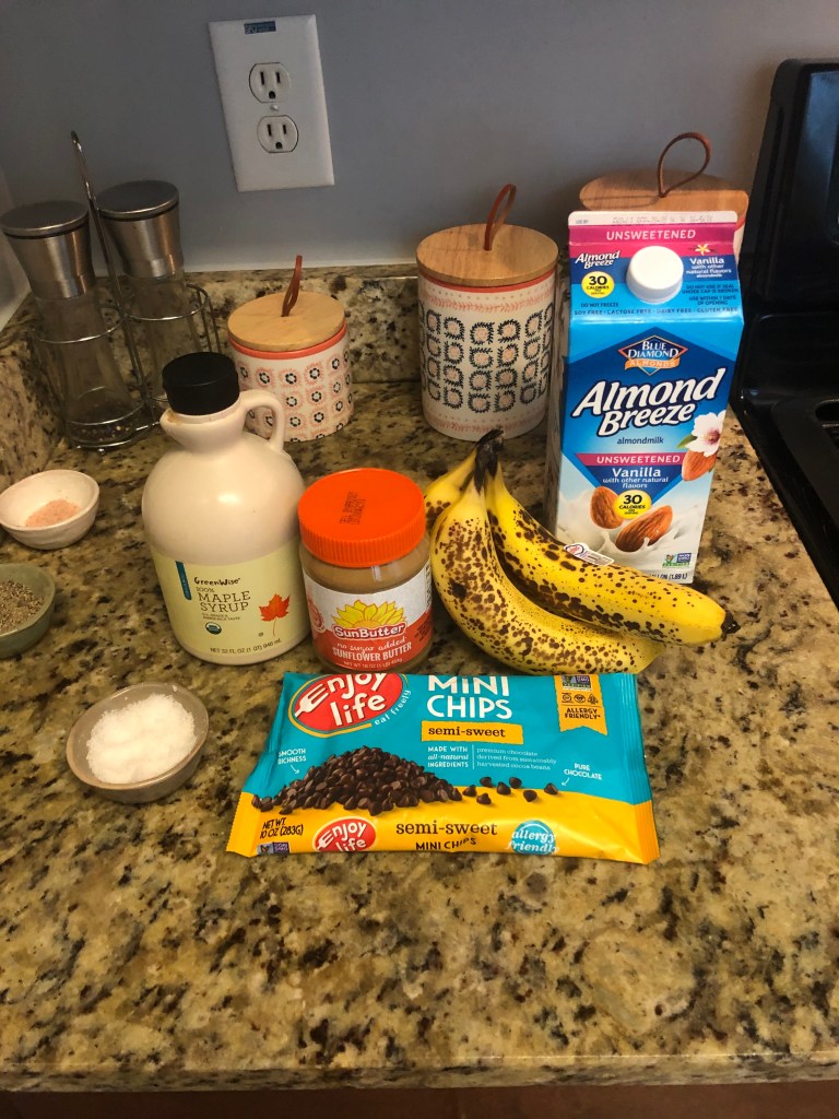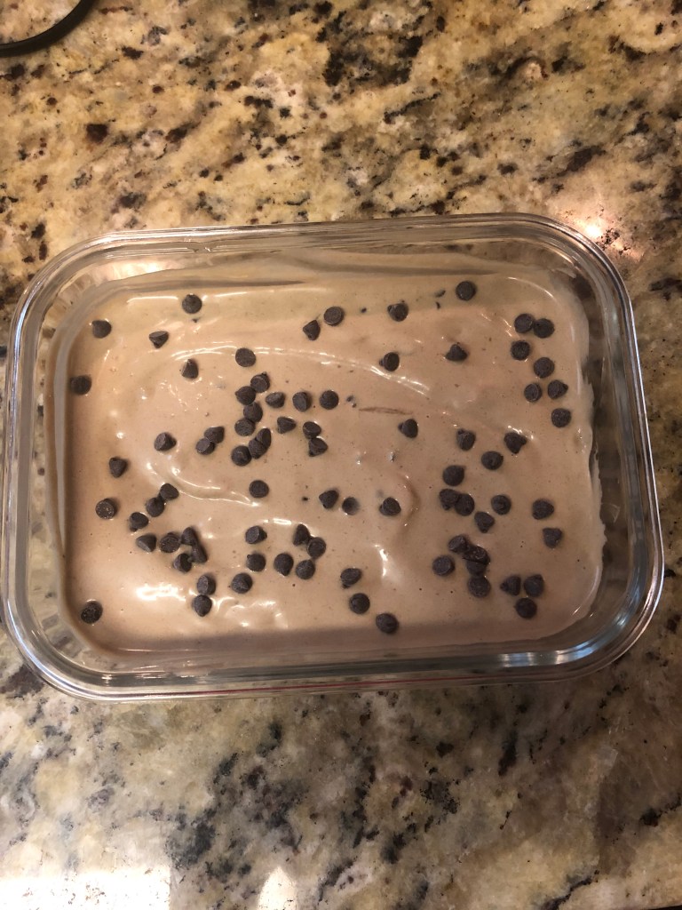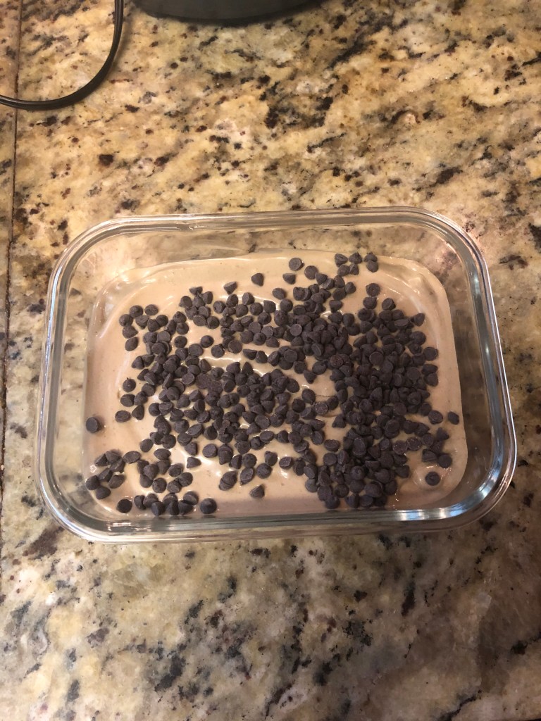 - Fold in chocolate chips (I folded in half and and then topped the nice cream with the other half)