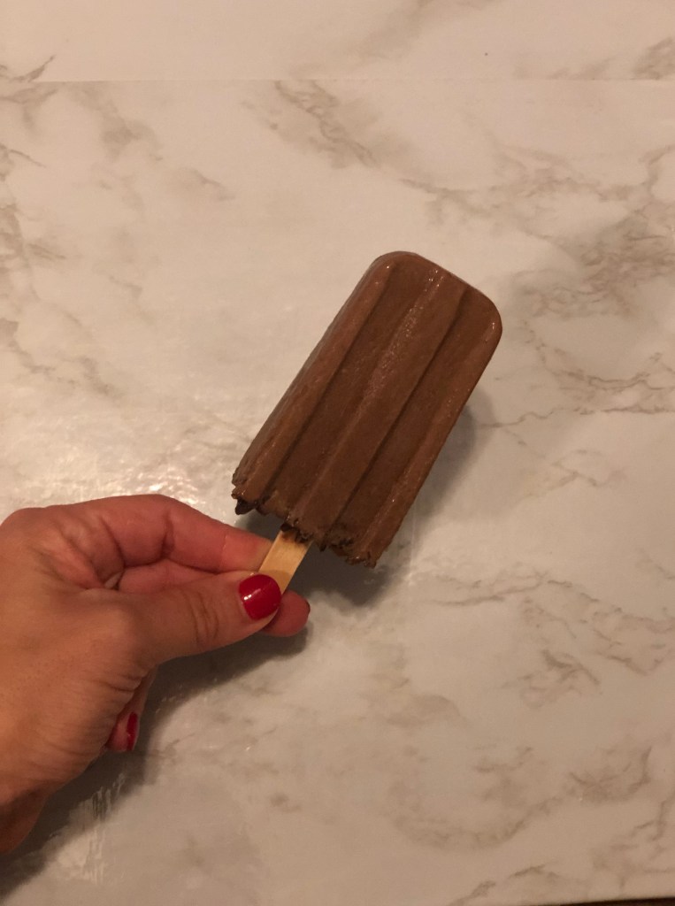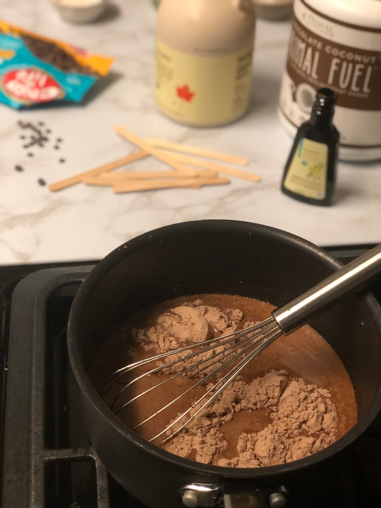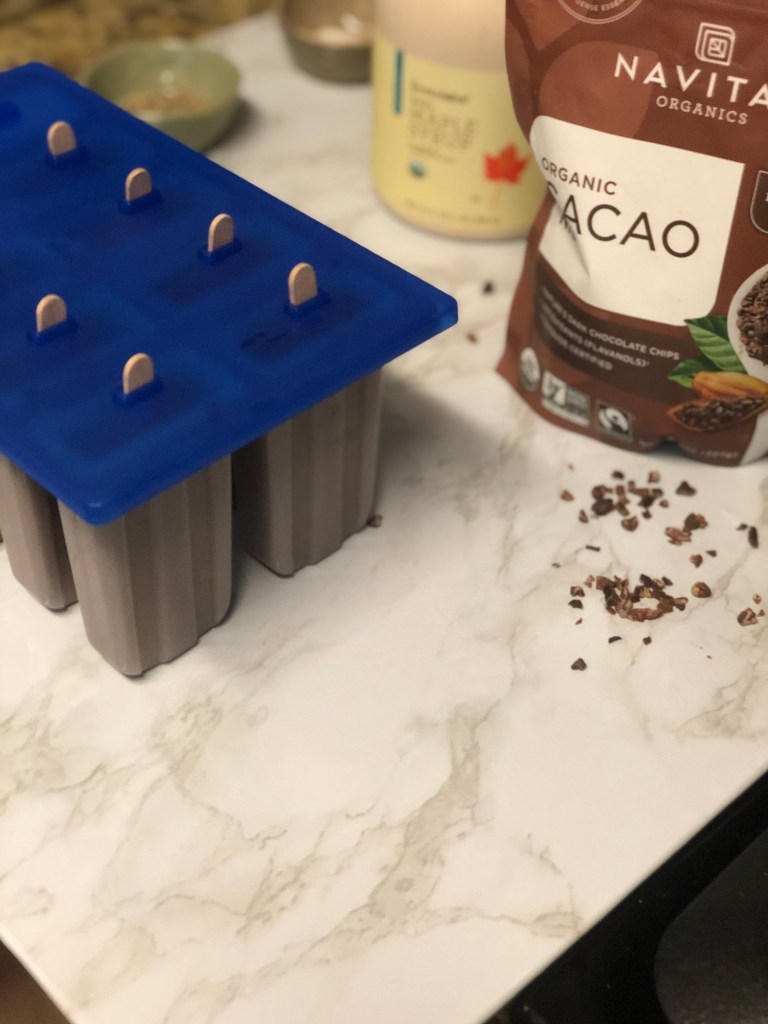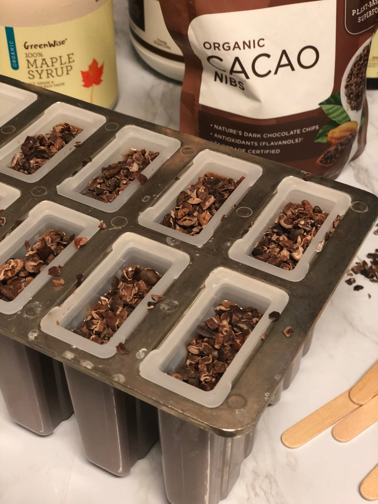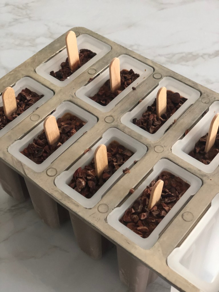 - Top your pops with the cacao nibs, place the lid on top and insert your popsicle sticks