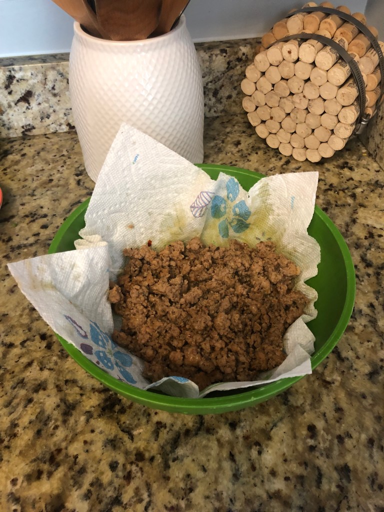 - Brown your sausage in a large skillet over medium high heat, crumbling it into small pieces until it’s done; use a slotted spoon to remove and set aside on a paper towel lined plate to soak up excess grease (leaving behind grease to cook veggies)