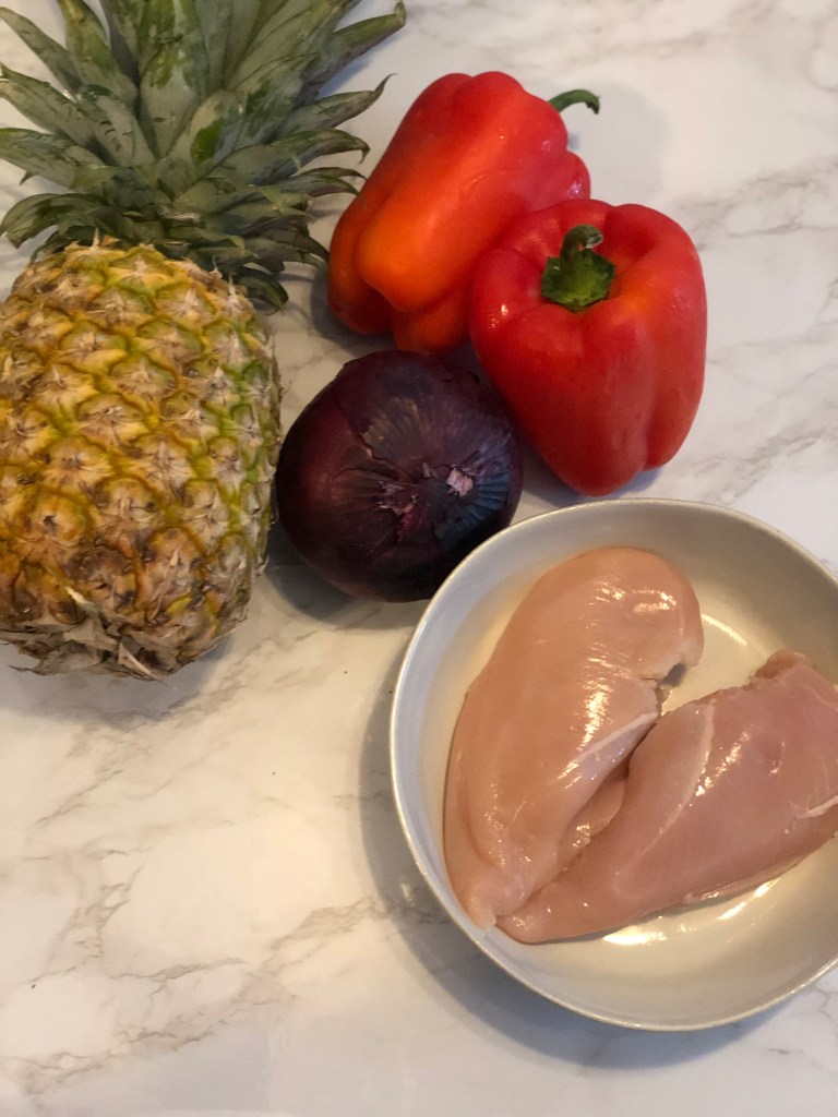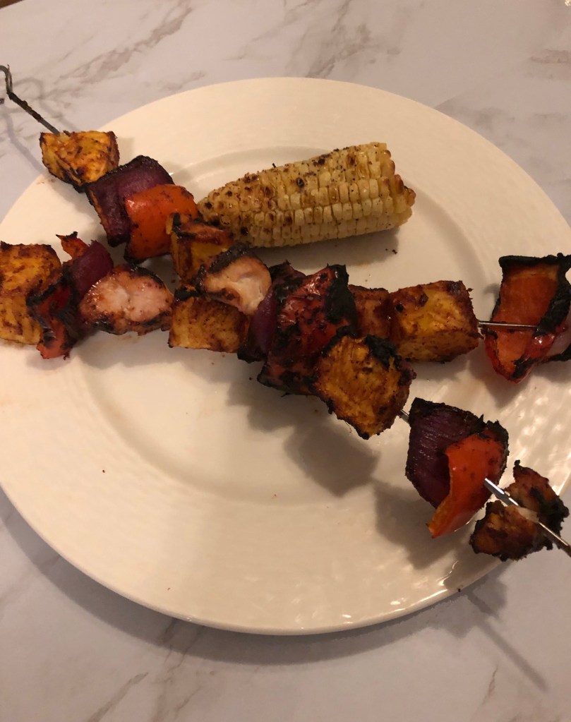 - Dice your chicken and veggies into kabob size pieces and build your kabobs